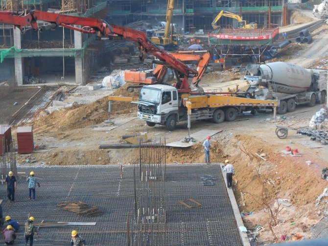 寶利豐廣場項目樓位于徽州大道與靶場路交口,其中1#樓采用樁筏基礎(chǔ),其中核心筒區(qū)域筏板厚度為7-8m,其他區(qū)域厚度為3.2m,混凝土強度等級為C40P8,一次性連續(xù)澆筑。施工現(xiàn)場布置56m汽車泵一臺,46m汽車泵兩臺,地泵一臺,截止2015年09月27日用時約40小時,8600立方混凝土全部澆筑完畢。