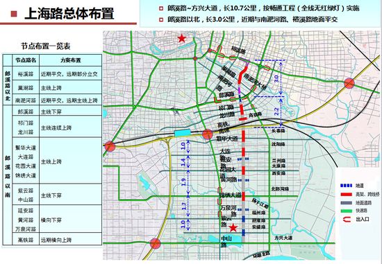 上海路暢通工程(郎溪路—方興大道)由中鐵十局承建,長(zhǎng)10.7公里,按暢通工程(全線無紅綠燈)實(shí)施;郎溪路以北至裕溪路,長(zhǎng)3.0公里,近期與南淝河路、裕溪路地面平交。巢湖路及南淝河大橋節(jié)點(diǎn):南淝河大橋主線跨過巢湖路落地,南淝河大橋采用下承式鋼桁架橋,橋面寬40米,雙向六車道,主跨130米。該項(xiàng)目主題結(jié)構(gòu)設(shè)計(jì)使用年限為100年,全部采用耐久性砼。